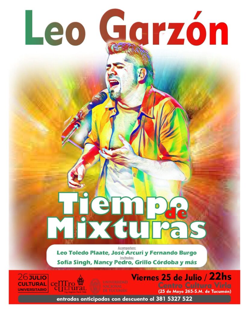 El viernes 25 de julio a las 22 hs, el músico y compositor tucumano Leo Garzón vuelve al Centro Cultural Ing. Eugenio Flavio Virla (25 de Mayo 265, San Miguel de Tucumán), el mismo escenario donde hace 20 años dio sus primeros pasos, para presentar su nuevo espectáculo: “Tiempo de Mixturas”, en el marco del Julio Cultural Universitario.